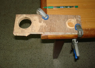 We always seem to have more keys than we have locks. Most of them end up in a box in a cupboard, but for the ones we actually use, this was a simple key holder. There is nothing to it actually. It is a piece of teak wood beading with hooks placed in it at regular intervals. The beading is screwed on to the wall with two screws (counter sunk to accommodate the heads). Each of the hooks needed guide holes to be drilled in first though. This piece is very easy to make. It has a nice simplicity about it too.